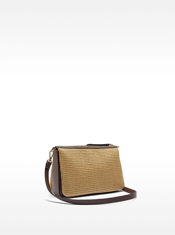 Üç bölmeli, hasır efektli çapraz askılı çanta. İç astarlı. Fermuar kapamalı. Fermuarlı dış cep. Ayarlanabilir askılı.
