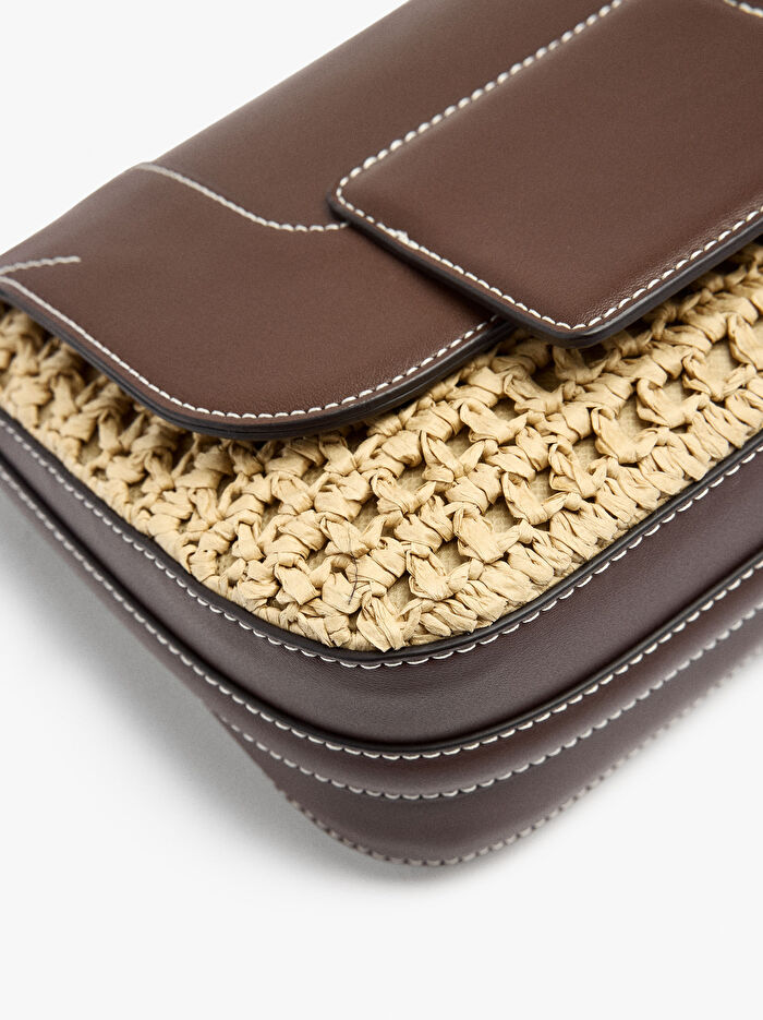 Hasır efektli küçük ve yapılı el çantası. İç astar. Kontrast dokulu ve mıknatıslı kapaklı kapatma. Çıkarılabilir bileklik askısı. Ayarlanabilir ve çıkarılabilir çapraz askılı çanta askısı içerir.