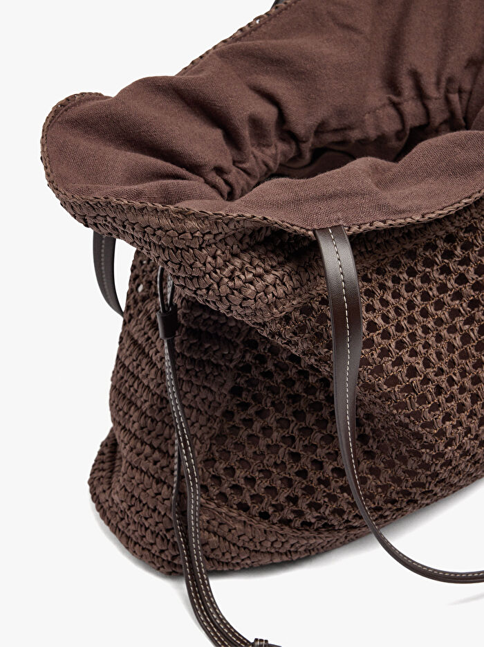 Esnek hasır efektli shopper çanta. Büyük boy. Astar ve iç cep. Toplamak için yanlardan büzme ipleri ile kapatma. Sabit omuz sapları.
