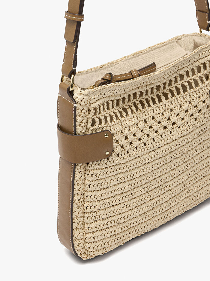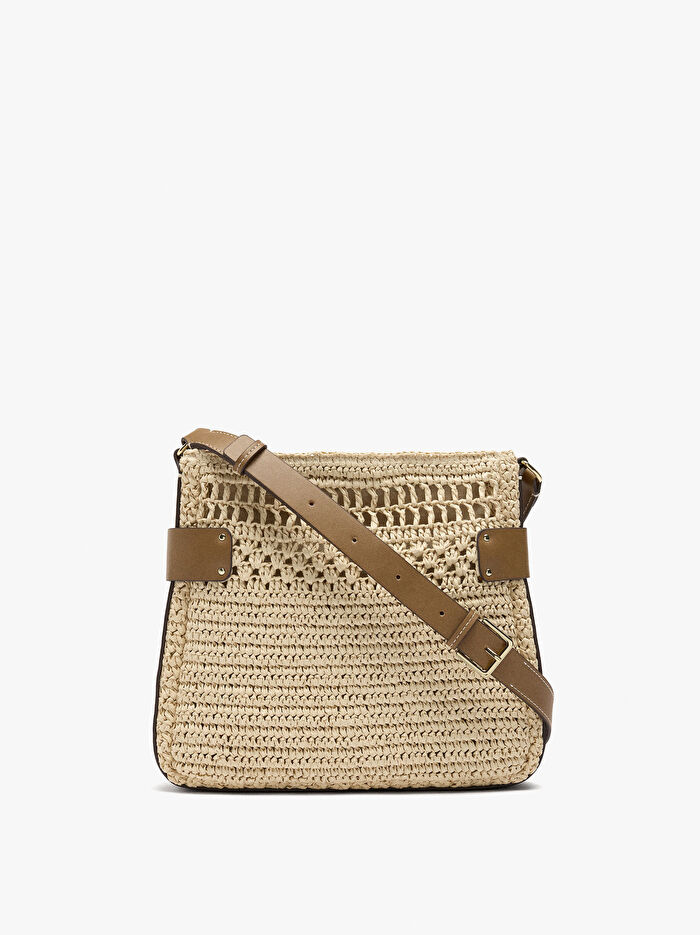 Kağıt hasır efektli örgülü büyük çapraz askılı çanta. Kare şeklinde. Astar ve iç cep. Fermuarlı kapatma. Ayarlanabilir ve çıkarılabilir çapraz askılı çanta askısı.