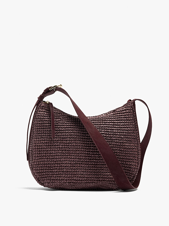 Hasır efektli omuz çantası. Orta boy. Yuvarlak şekil. Astar ve iç cep. Fermuarlı kapatma. Tokalı, sabit ve ayarlanabilir askı.