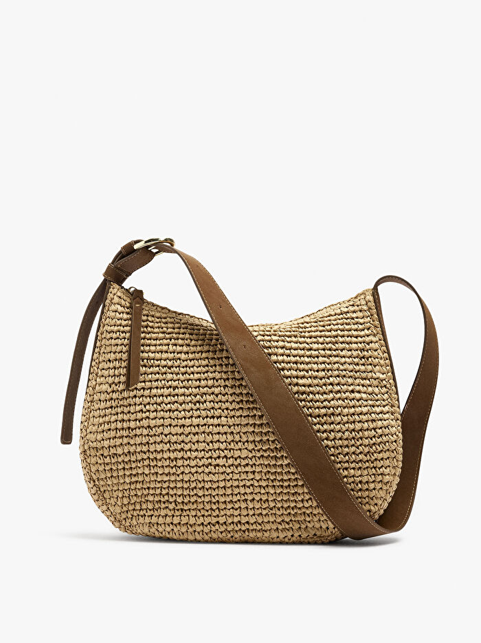 Hasır efektli omuz çantası. Orta boy. Yuvarlak şekil. Astar ve iç cep. Fermuarlı kapatma. Tokalı, sabit ve ayarlanabilir askı.
