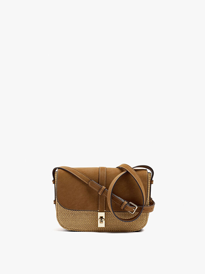 Kapaklı ve çevirerek kilitlenen, yapısal çapraz askılı çanta. Astar ve iç cep. Hasır efekti detay. Sabit ve ayarlanabilir askı.