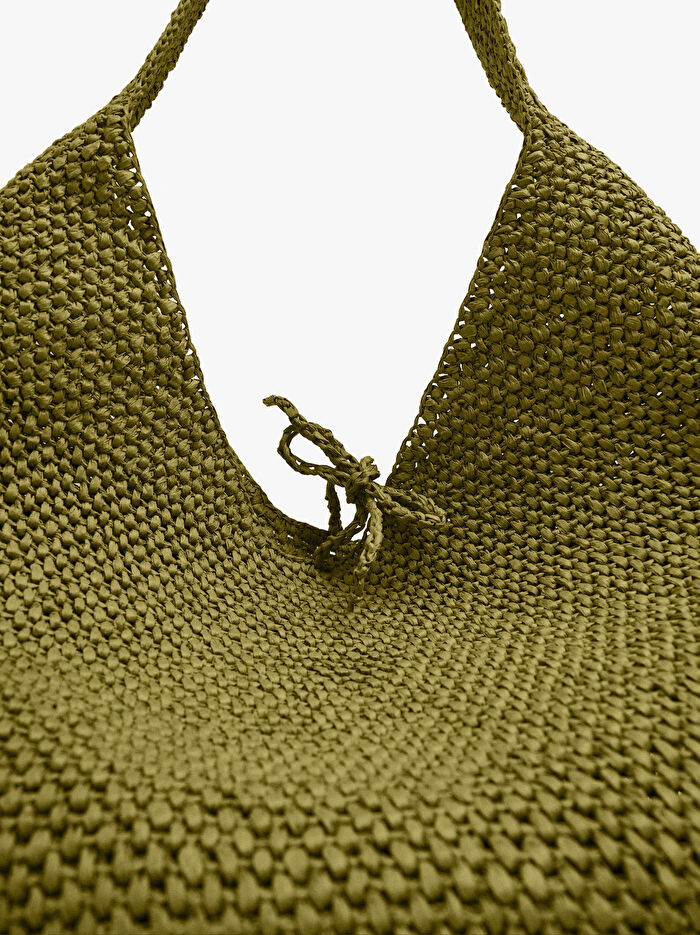 Esnek hasır efektli omuz çantası. Orta boy. Bağlama kayışları ile kapatma. Sabit askı.