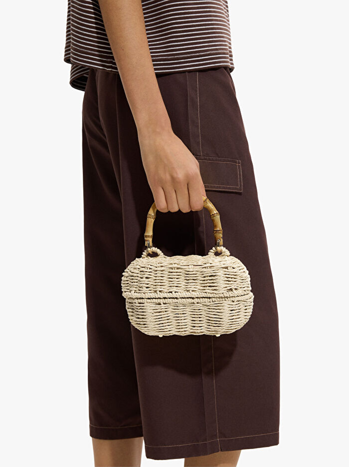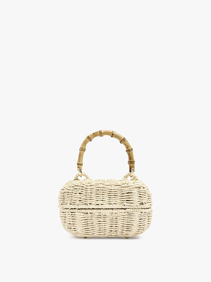 Yapılı, uzun ve yuvarlak kenarlı parti el çantası. Hasır efekti. Üst kısımda bambudan sabit askı. İç astar. Kopçalı kapatma. Çıkarılabilir zincir askı.