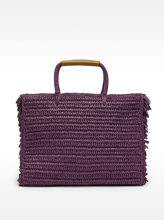 Yanlarında püsküller bulunan hasır efektli büyük shopper çanta. Astarlı ve iç cepli. Fermuarlı kapama. Sabit el askıları.