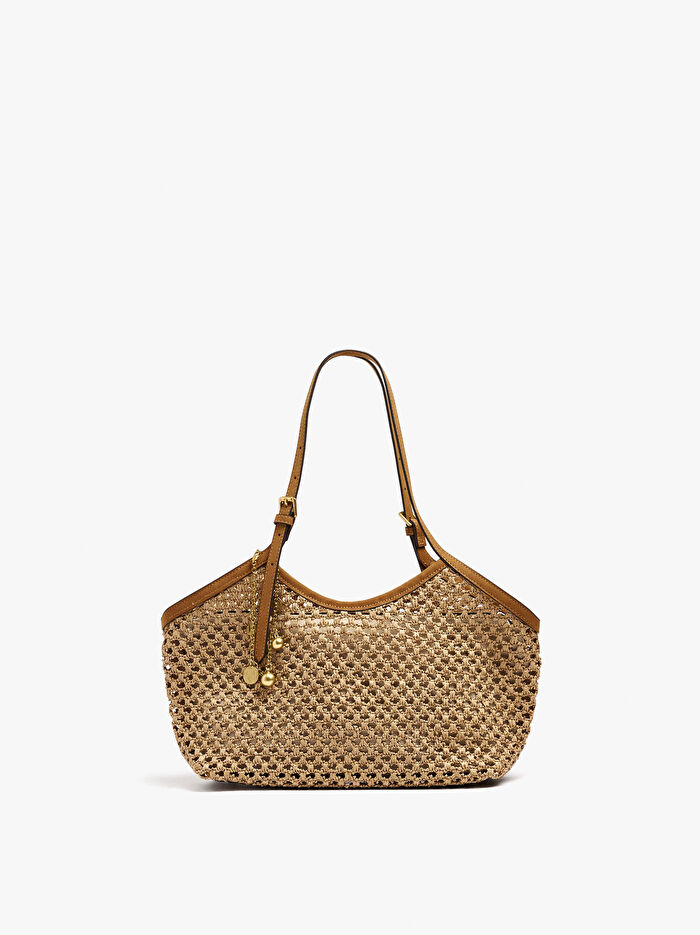 Hasır efektli küçük tote çanta. Astar ve iç cep. Fermuarlı kapatma. Zincir pandantif. Sabit ve ayarlanabilir omuz askıları.