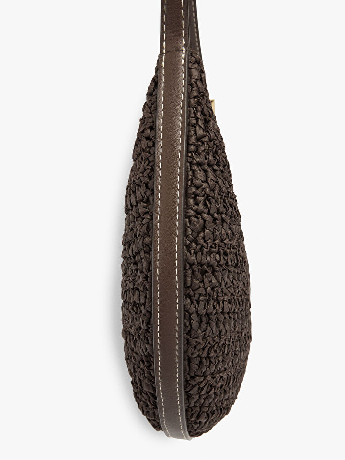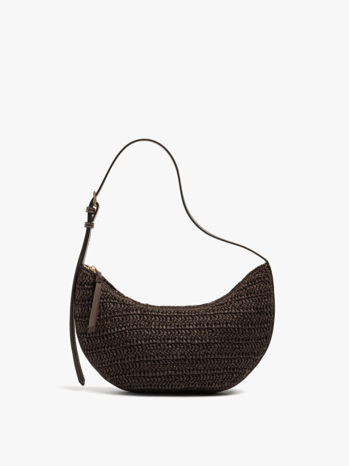 Hasır efektli küçük hilal şeklinde omuz çantası. Astar ve iç cep. Fermuarlı kapatma. Tokalı, sabit ve ayarlanabilir askı.