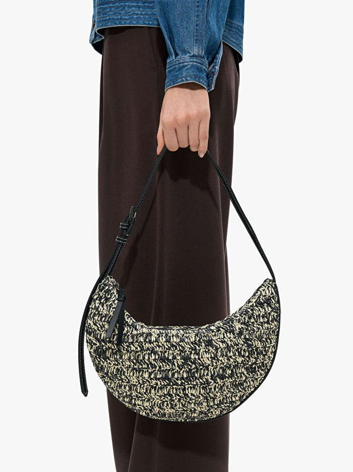 Hasır efektli küçük hilal şeklinde omuz çantası. Astar ve iç cep. Fermuarlı kapatma. Tokalı, sabit ve ayarlanabilir askı.