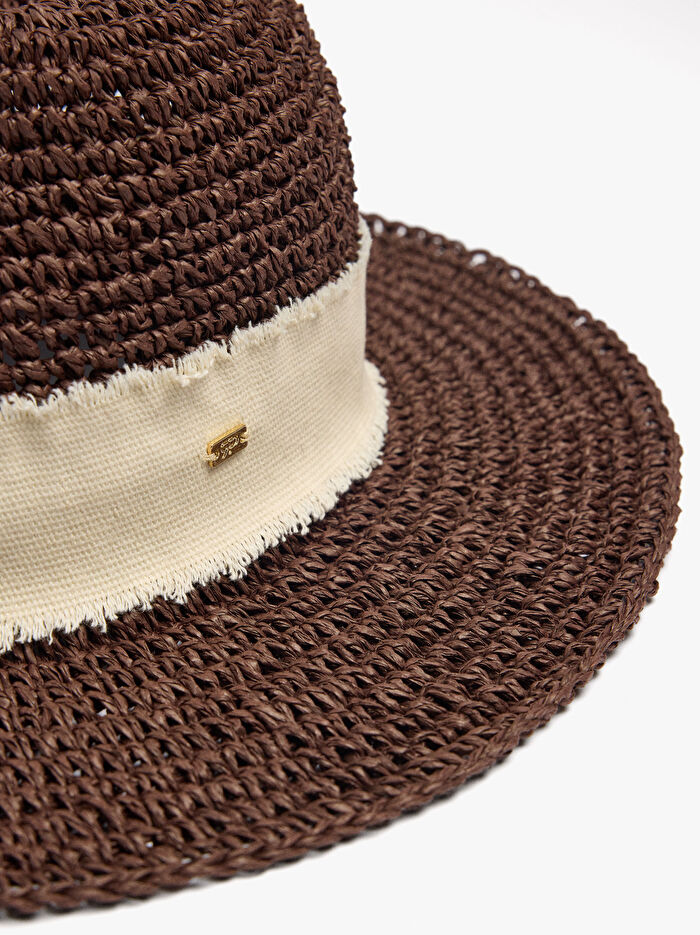 Hasır efektli şapka, kumaş bant detaylı ve kontrast renkte. Rahat ve modern, gündelik stili sofistike bir bitişle birleştirerek her görünüme ayırt edici bir dokunuş katar.