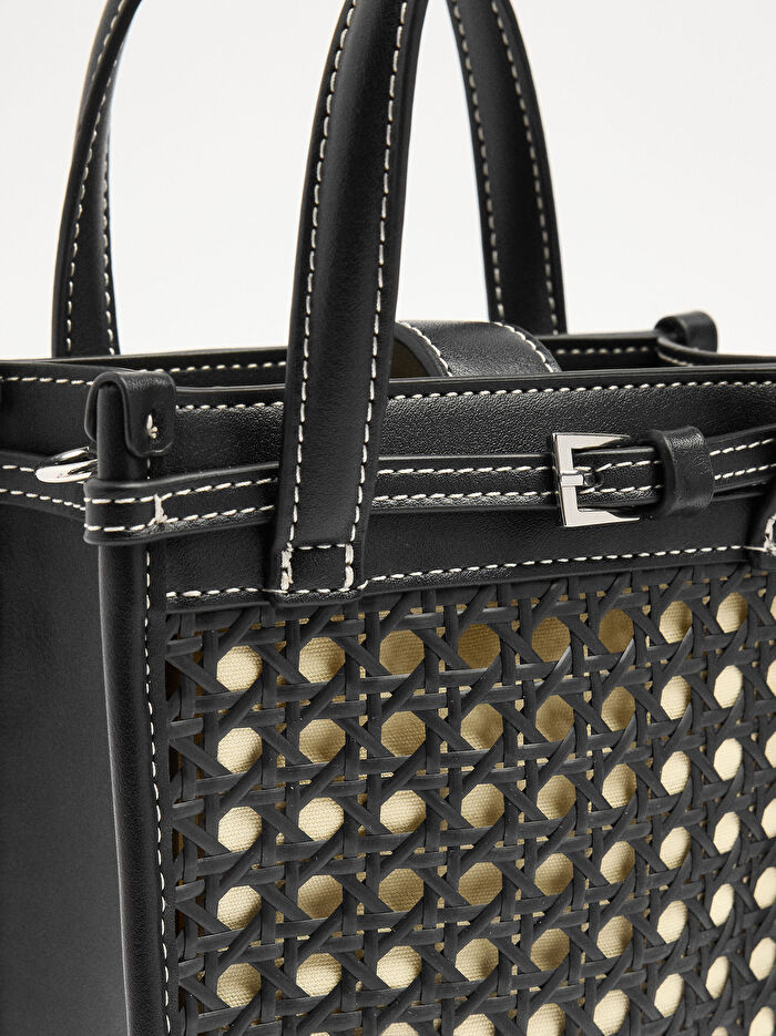 Ön kısımda hasır detayı ve kemer bulunan küçük dikdörtgen el çantası. Büzme ipli iç astar. Manyetik kapatma. Sabit saplar. Ayarlanabilir ve çıkarılabilir çapraz askılı çanta askısı içerir.