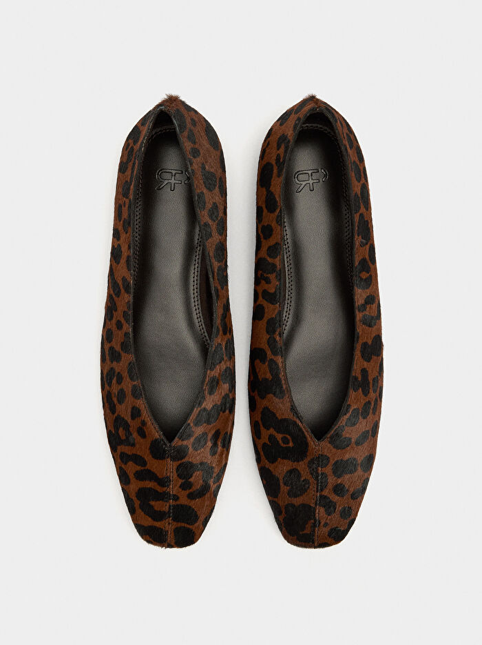 Kürk ve hayvan desenli deri babet. Belirgin dikişli yastıklı iç taban. Oval burunlu. Termoplastik poliüretan taban.