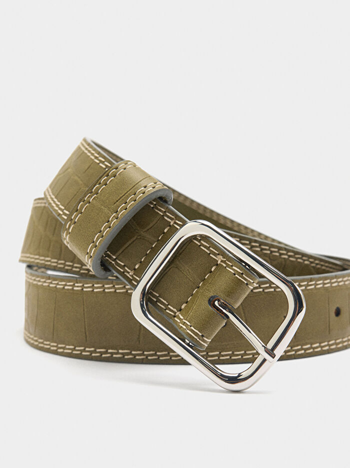 Hayvan gravürlü ve kenarlarında belirgin dikişli kemer. Kare metal toka. Yuvarlak uçlu.