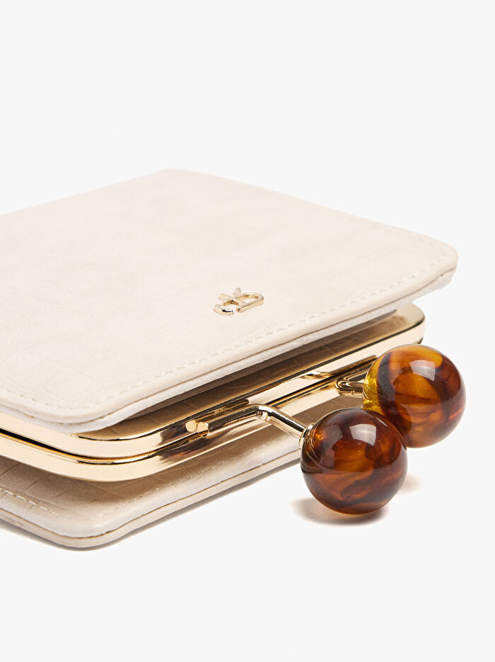 Hayvan motifli küçük cüzdan. Kart yuvaları ve kağıt para bölmesi. Kiss-lock kapamalı ve reçine boncuk detaylı şık cep. Çıtçıt düğmeli ana kapama.