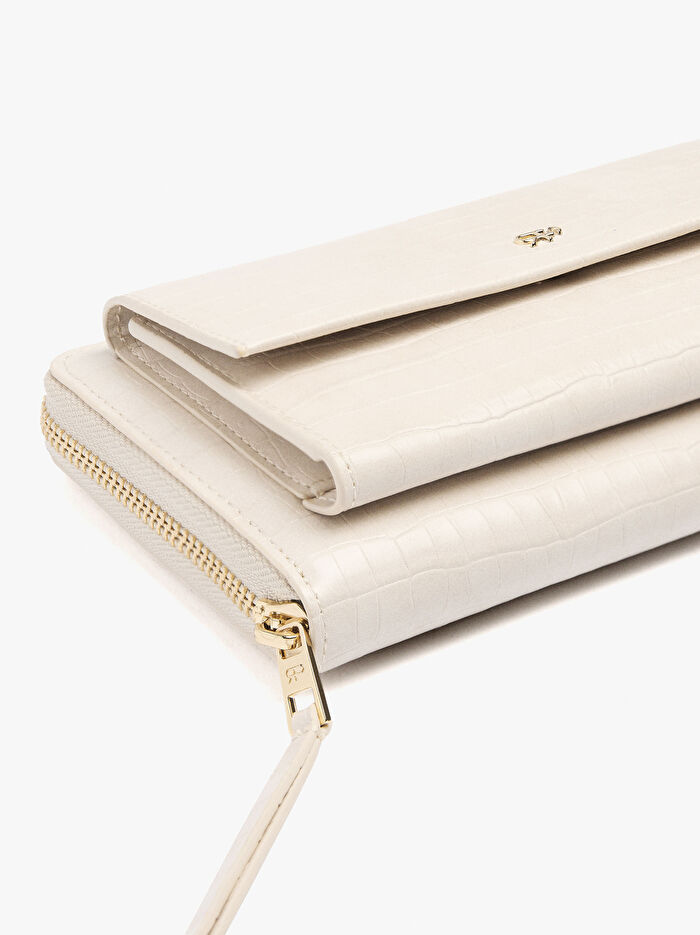 Hayvan motifli büyük cüzdan. Kart yuvaları ve kağıt para bölmeleri bulunan iki bölme: biri kapaklı ve çıtçıtlı; diğeri fermuarlı ve bozuk para bölmesi.