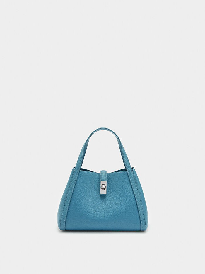 Dokulu orta boy tote çanta. Fermuarlı çıkarılabilir iç cep. Düğmeli kapama. Çift el sapı. Ayarlanabilir ve çıkarılabilir çapraz askı.
