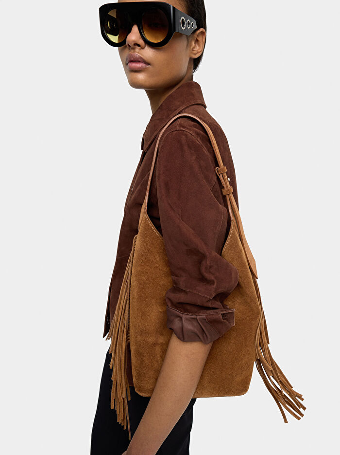 İç cepli büyük deri omuz çantası. Dikdörtgen şekilli. Belirgin dikişler. Istakoz kopçalı kapama. Uzun yan saçaklar. Sabit ve ayarlanabilir askı. Minimalist ve zarif tasarım. Günlük kullanım ve gündelik ortamlar için ideal.
