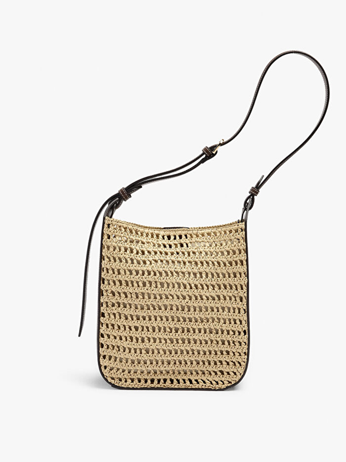 Fermuarlı, çıkarılabilir poşetli hasır efektli omuz çantası. Orta boy. Dikdörtgen form. Mıknatıslı ana kapatma. Sabit ve ayarlanabilir askı.