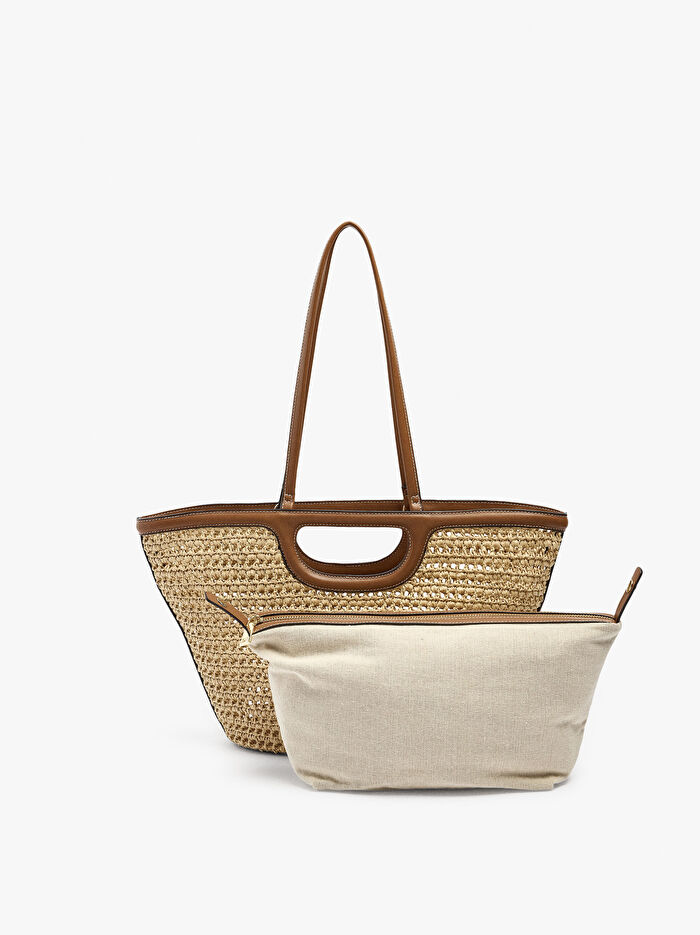 Hasır efektli, yapılı ve çıkarılabilir fermuarlı poşetli tote çanta. Büyük boy. Entegre el askısı. Sabit omuz askıları.