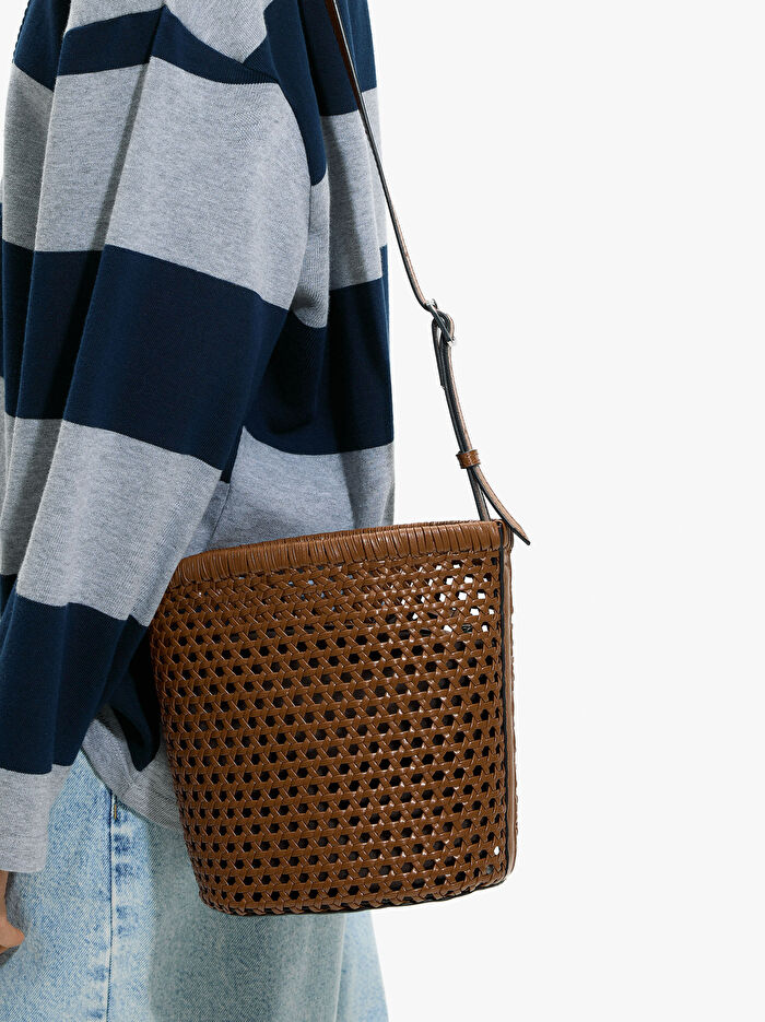 Küçük ve örgülü bucket çanta. Fermuarlı kapatmalı çıkarılabilir iç poşet. Sabit ve ayarlanabilir askı.