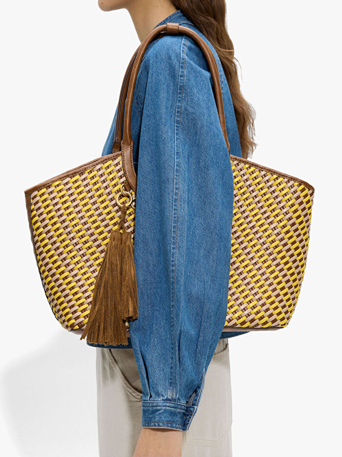 Büyük örgülü shopper çanta. İç astar. Çıkarılabilir iç poşet ve kolye. Manyetik kapatma. Sabit el askıları veya omuz askıları.