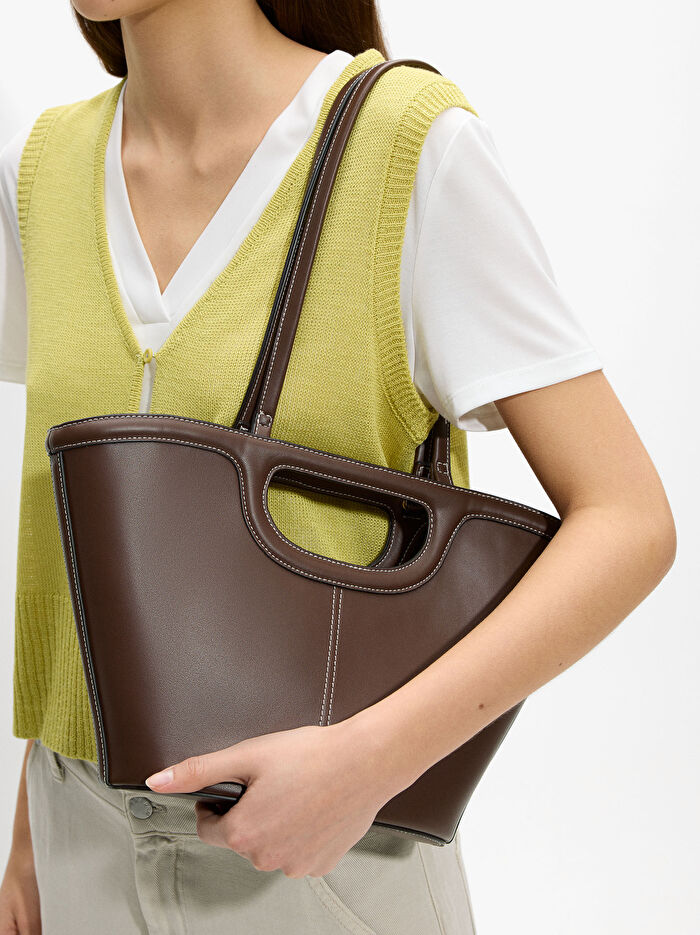Çıkarılabilir, fermuarlı poşetli sade ve yapılı tote çanta. Büyük boy. Entegre el tutacağı. Sabit omuz askıları.