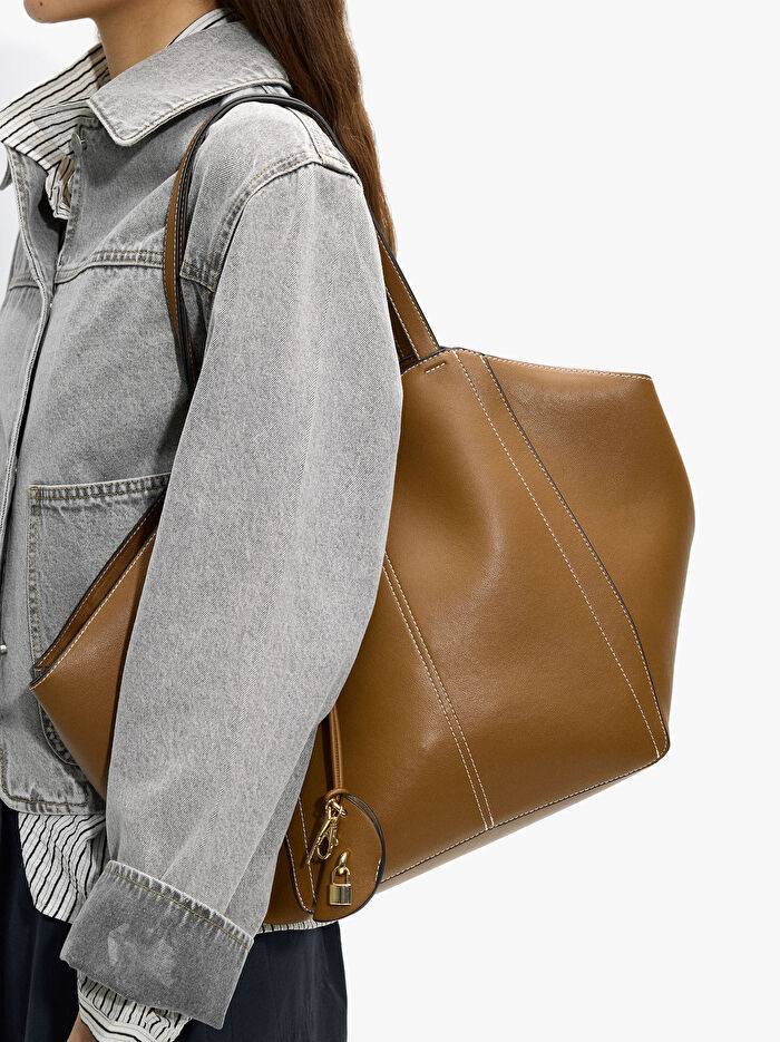 Çıkarılabilir iç cep ile büyük düz shopper çanta; fermuarlı kapama. İç astar. Ana manyetik kapama. İşaretli üst dikiş. Çıkarılabilir charm. Sabit omuz askıları.