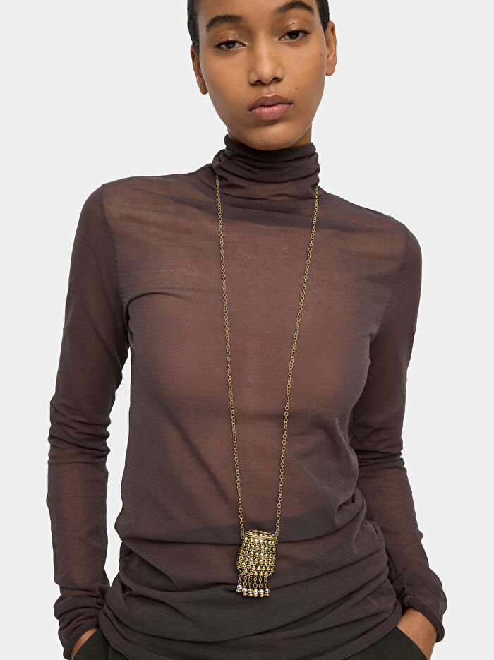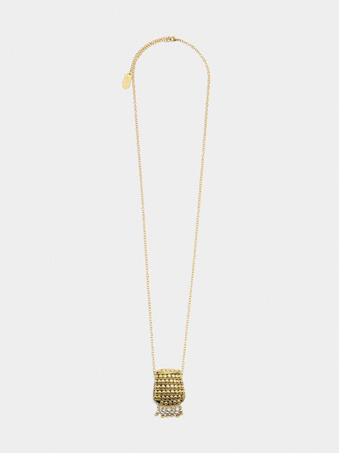 Mini halkalı uzun kolye. Alt kısmında yuvarlak detayları ve metalik küreleri olan oval cep şeklinde pandantif. Istakoz kopçalı kapatma.