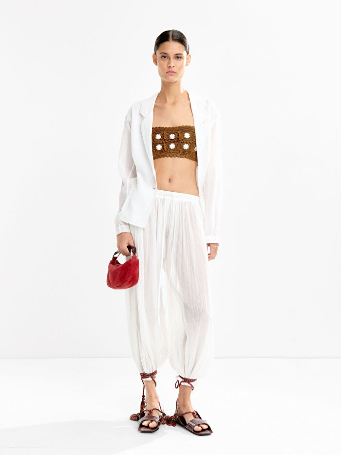 İnce askılı kroşe crop. Yuvarlak ayna detayları. Model 1.79 m boyunda olup XS-S beden giymektedir.