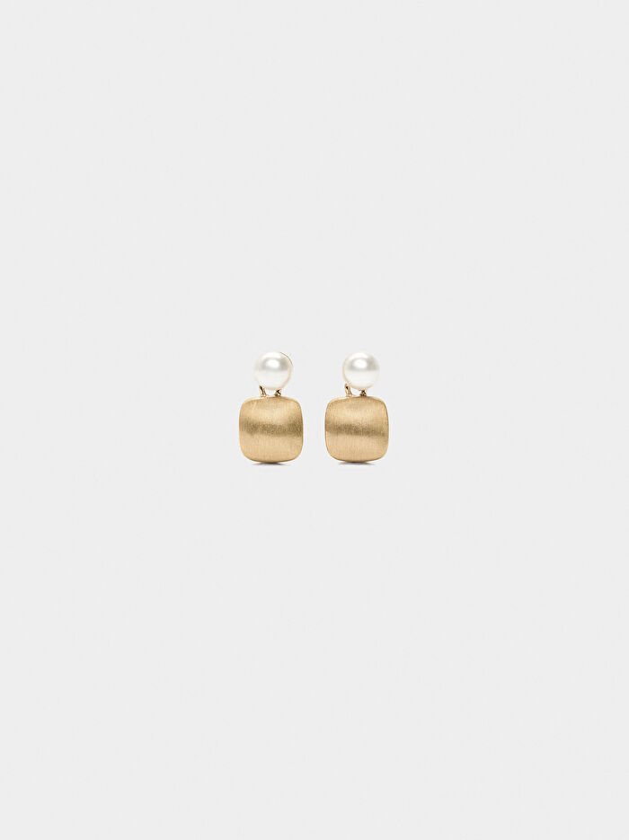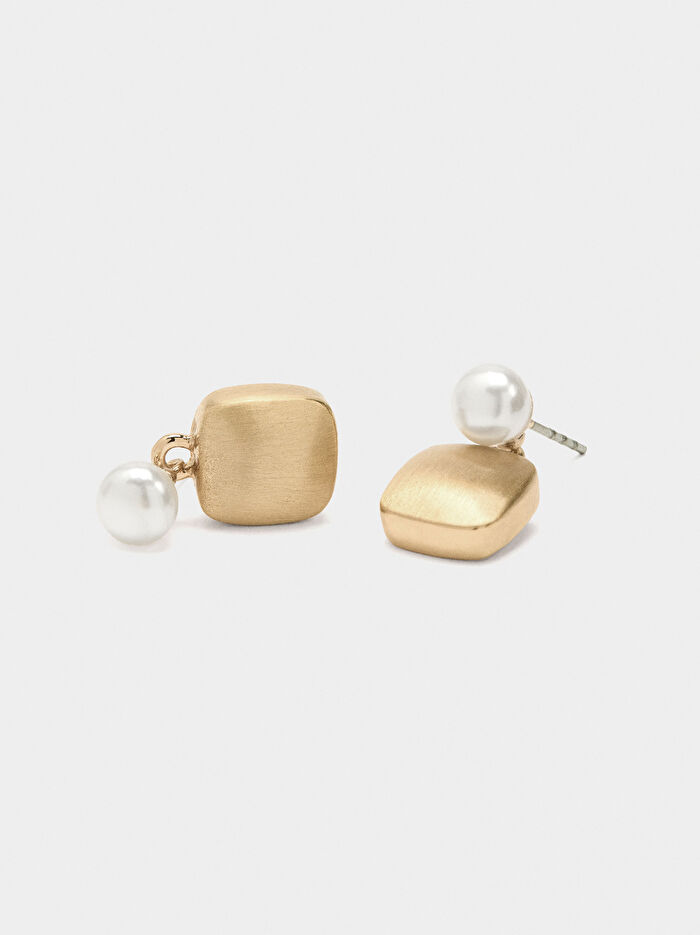 İnci tabanlı kısa kare küpeler. Fırça efekti.