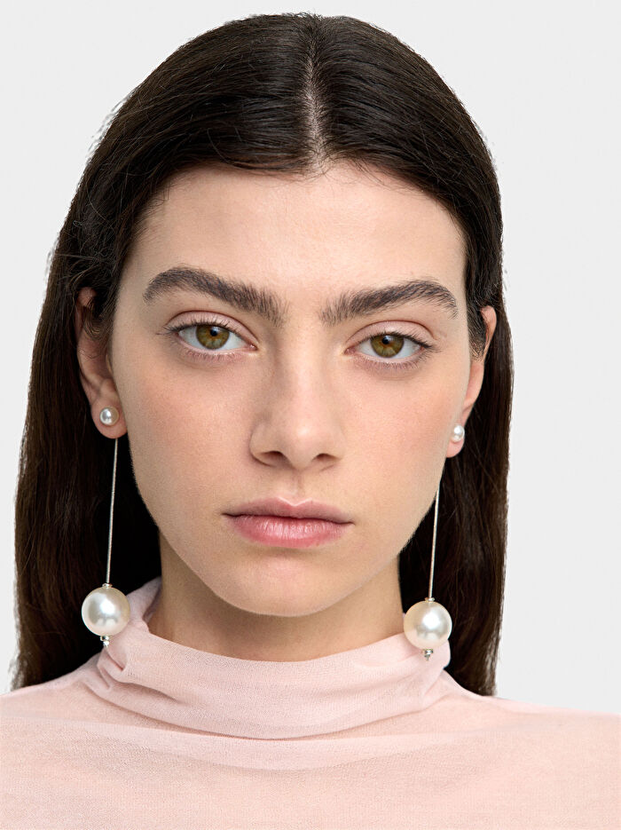 Zincirli ve charm’lı inci tabanlı uzun küpe.
