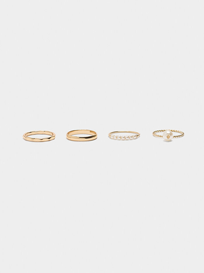 Farklı şekillerde dört yüzük seti: düz, düzensiz, örgülü ve incili.