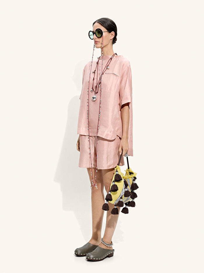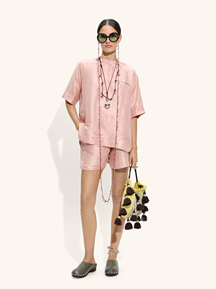 İpek ve keten karışımından yapılmış, dökümlü bir bluz. Yuvarlak yaka. Kısa kollu. Bir tarafında cep. Yuvarlak etek ucu, arka kısmı biraz daha uzun. Model 1,78 m boyunda ve XS-S beden giyiyor.