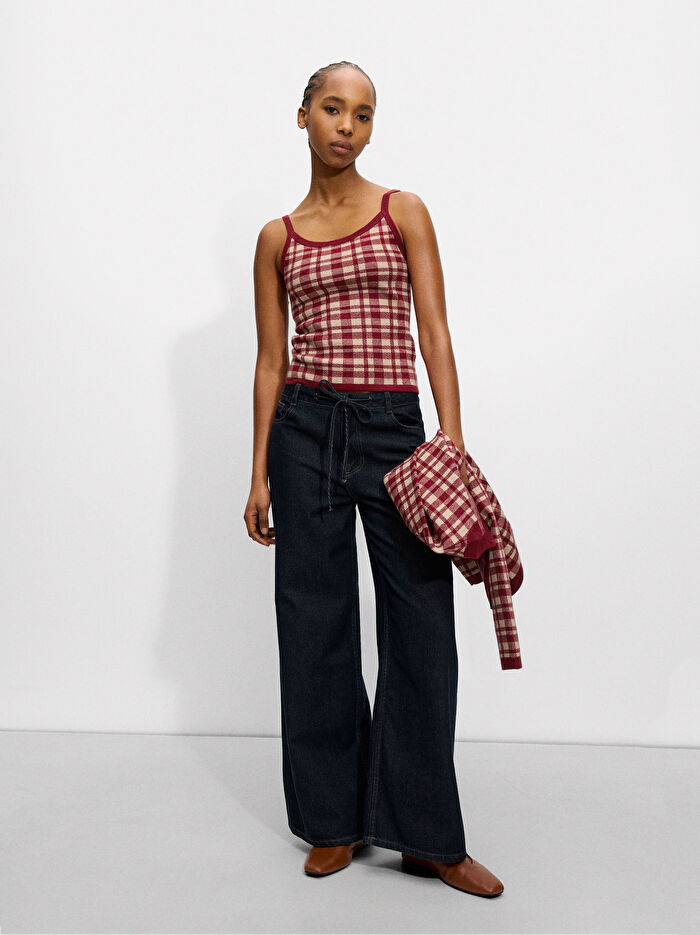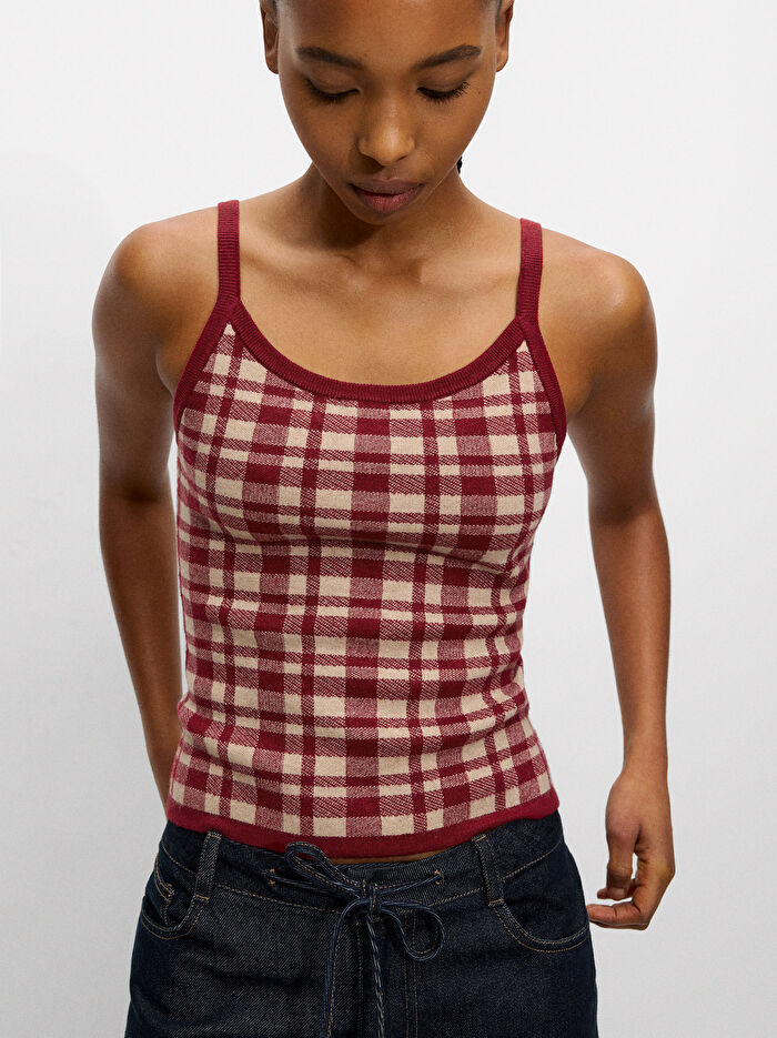 Jakarlı, kareli örme kolsuz üst. Yuvarlak yaka. Model 1.78 m boyunda olup S beden giymektedir.