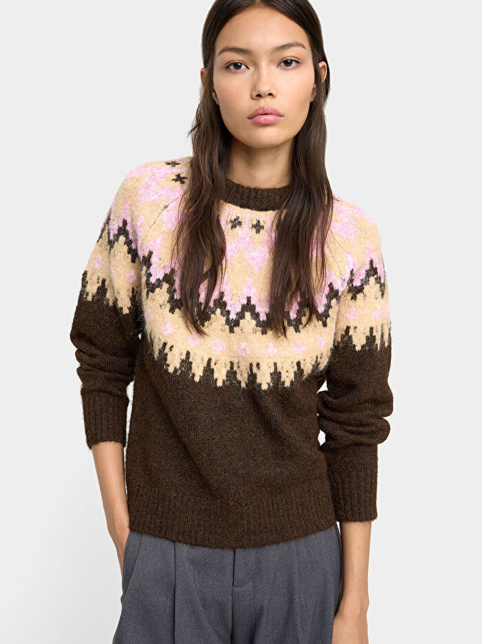 Üst kısmı geometrik desenli jakarlı örme kazak. Yuvarlak yaka. Uzun kollu. Nervürlü kenarlar. Model 1,76 m boyunda ve XS-S beden giyiyor.