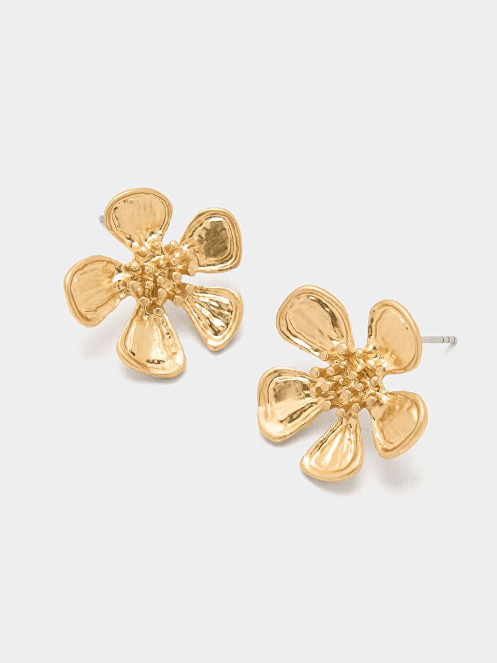 Çiçek şekilli kısa küpe. Kabartmalı orta kısım. Çizgili efektli yapraklar. Metal kenar.