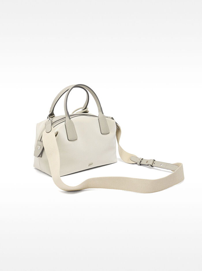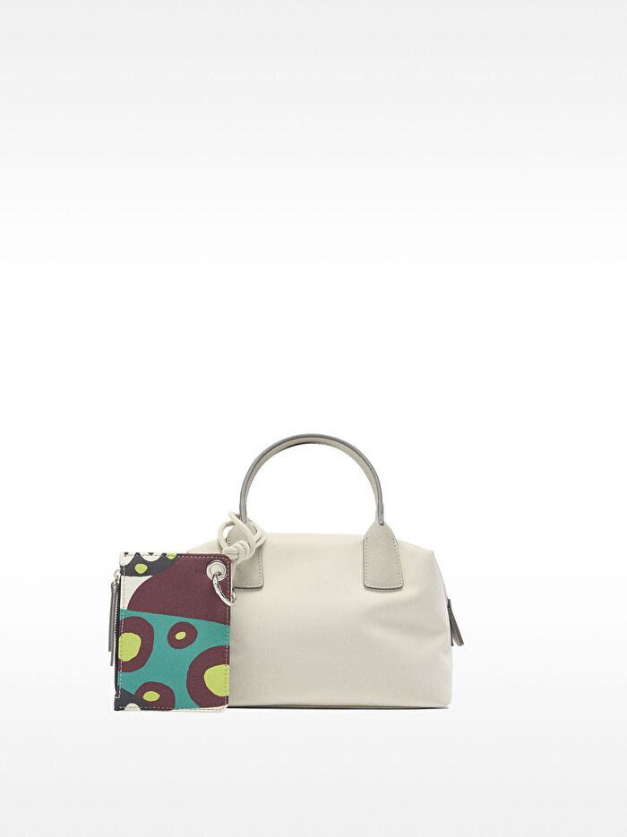 Kadife dokulu tote çanta. Orta boy. İç astar ve cep. Çıkarılabilir kese süsü. Fermuarlı kapatma. Sabit üst kulplar. Ayarlanabilir ve çıkarılabilir omuz askısı.