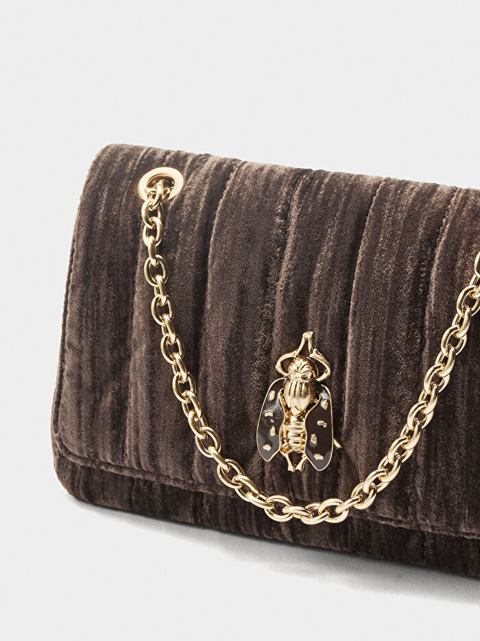 Küçük kadife parti çantası. Belirgin dikiş detayları. İç astar. Dış metal detaylı manyetik kapak kapatma. Sabit zincir askı.