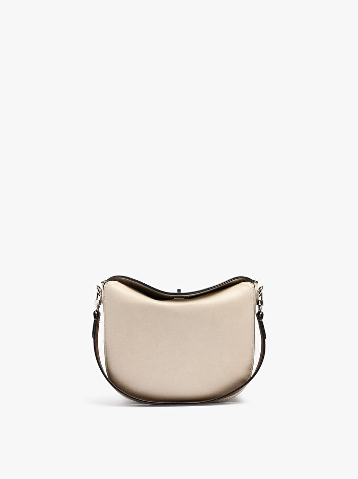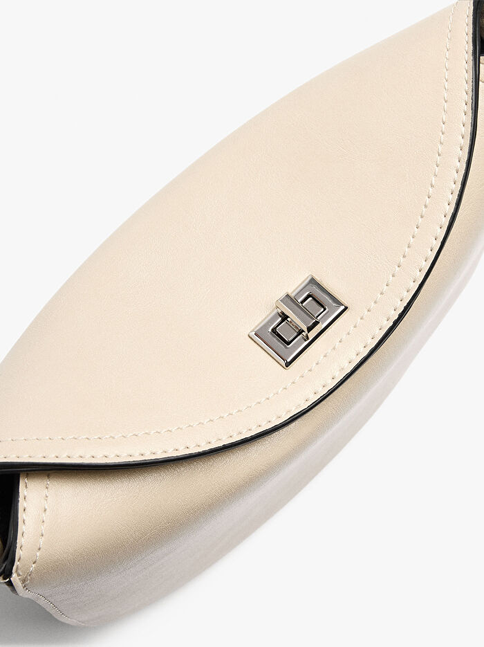 Çapraz kapaklı ve düğmeli kapatmalı sade çapraz askılı çanta. Astar ve iç cep. Orta bölme. Ayarlanabilir ve çıkarılabilir askı.
