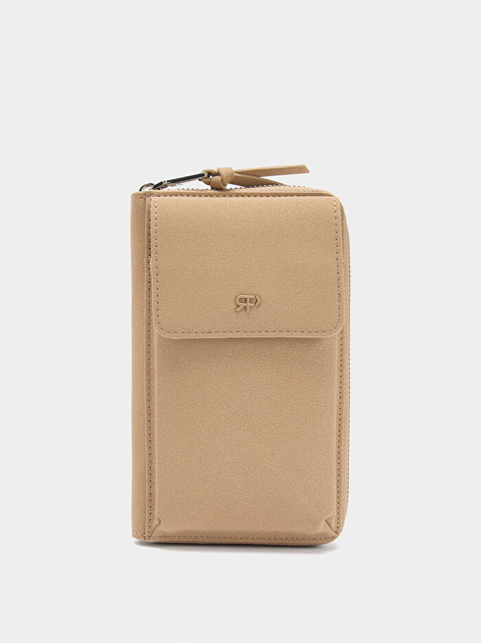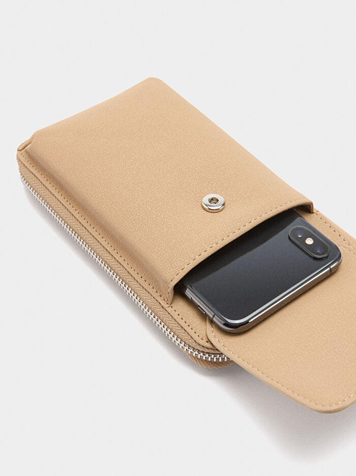Dokulu cep telefonu çantası. Kapaklı ve çıtçıtlı kapatma bölümü. Kart ve kağıt para bölmeleri; bozuk para cebi; fermuarlı kapatma. Dış kısımda bölmeler. Ayarlanabilir ve çıkarılabilir çapraz askılı çanta.