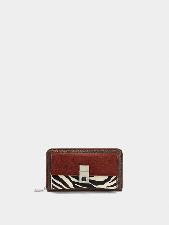 Deri detayları ve dokusu ile büyük cüzdan. İki bölme: biri manyetik kapaklı ve kart yuvalı; diğeri fermuarlı, kart yuvalı ve kağıt para bölmesi ile bozuk para bölmesi.
