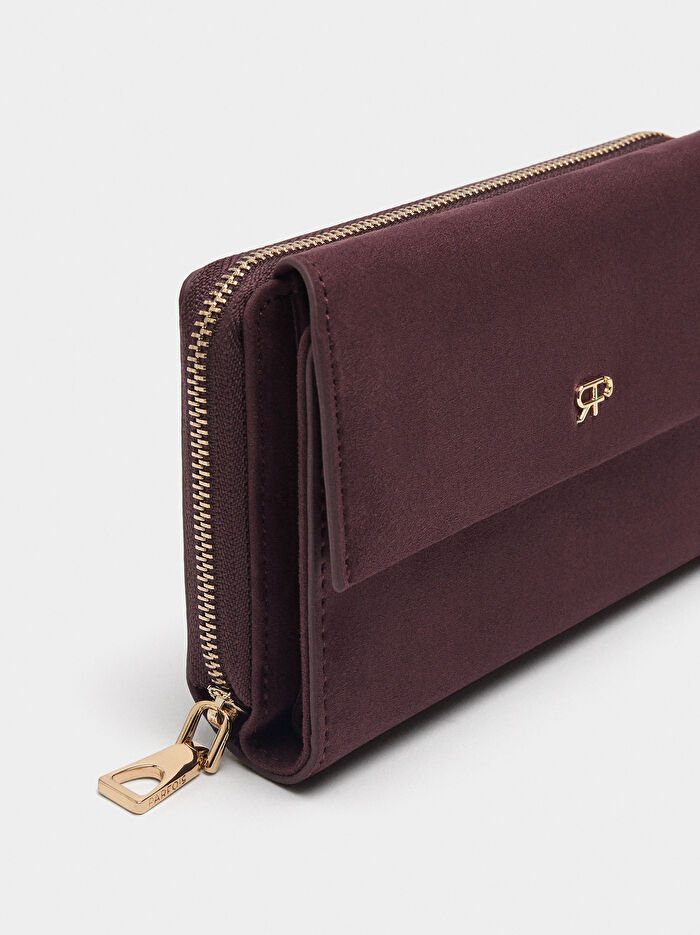 Orta boy suni kürk efektli cüzdan. Kart yuvaları ve kapaklı, çıtçıtlı düğme kapamalı kağıt para bölmesi. Fermuarlı bozuk para bölmesi.