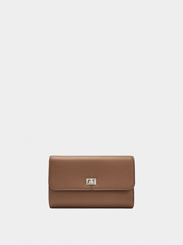 Kapaklı büyük düz cüzdan. İç kart yuvaları ve faturalar için alan. Fermuarlı bozuk para bölmesi. Döner düğme kapatma.