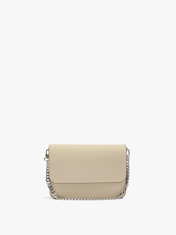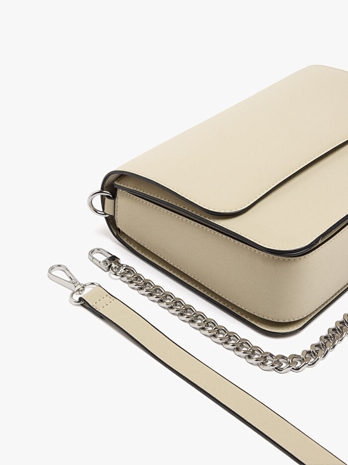 Orta boy, sade ve yapılı çapraz askılı çanta. Yumuşak doku. Manyetik kapaklı. Astarlı ve iç cep. Çıkarılabilir zincir askı. Ayarlanabilir ve çıkarılabilir çapraz askılı çanta askısı.