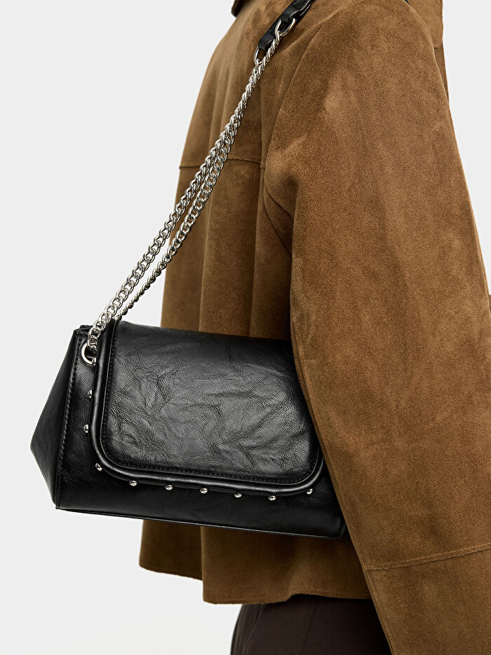 Çatlak efektli küçük omuz çantası. Astar ve iç cep. Manyetik kapak kapatma, kenarlarında zımba detayları. Sabit zincir saplar.