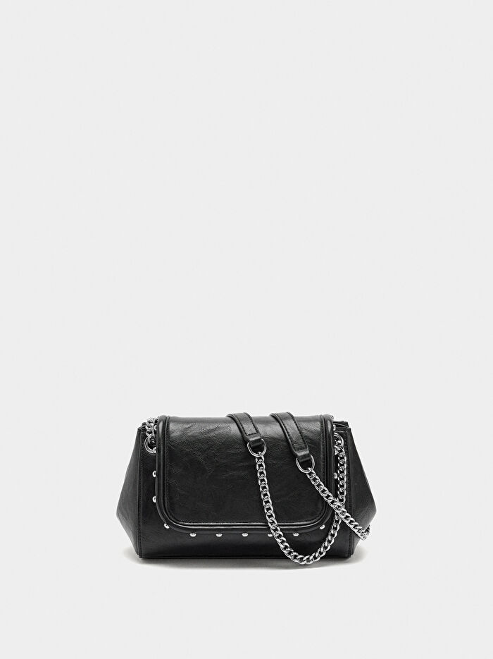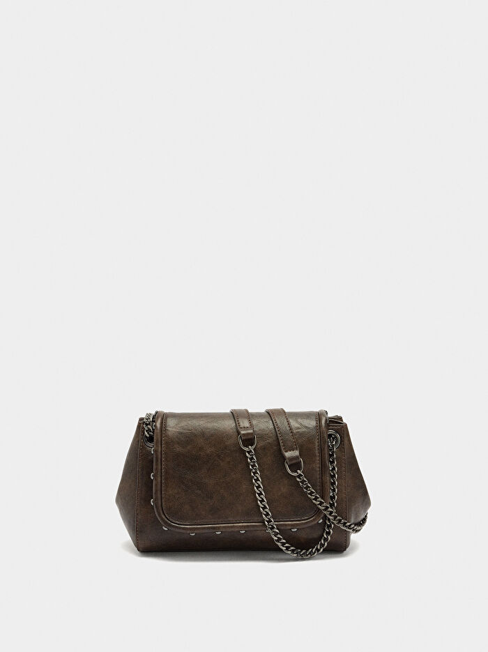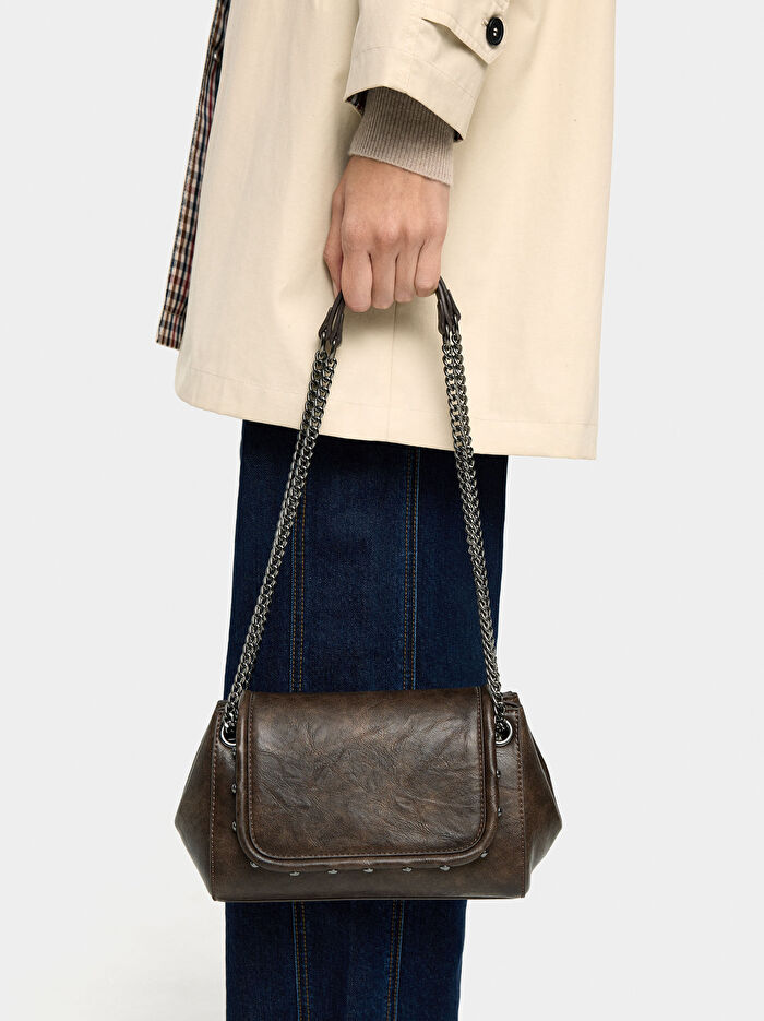Eskitme efektli küçük omuz çantası. Astar ve iç cep. Manyetik kapak kapatma, zımba detayları.Sabit zincir askılar.