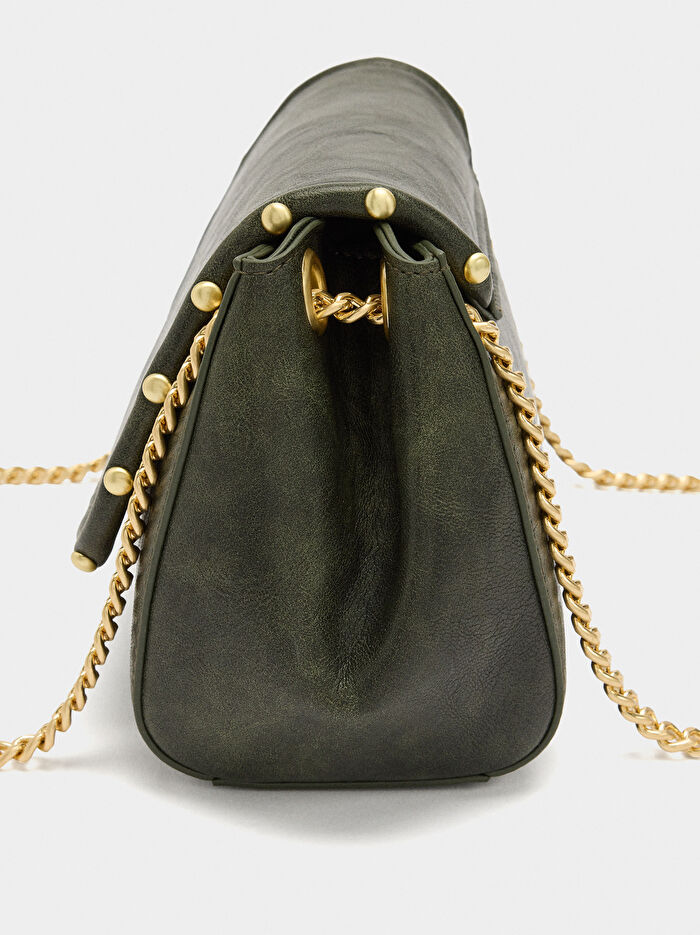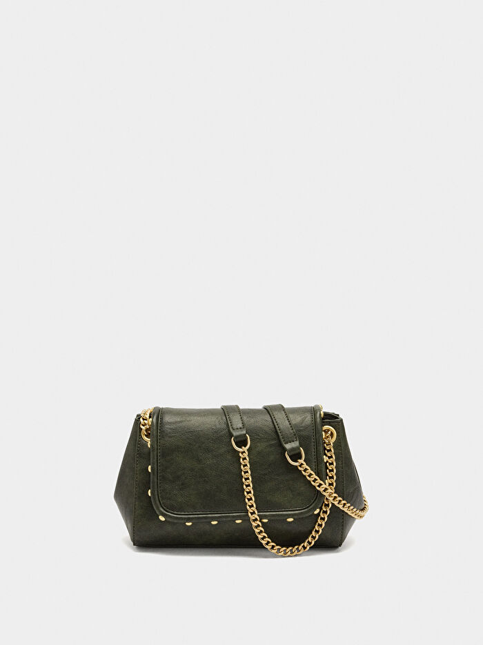 Eskitme efektli küçük omuz çantası. Astar ve iç cep. Manyetik kapak kapatma, zımba detayları.Sabit zincir askılar.