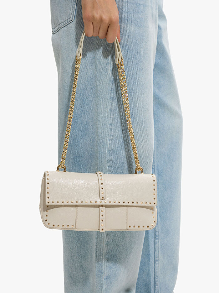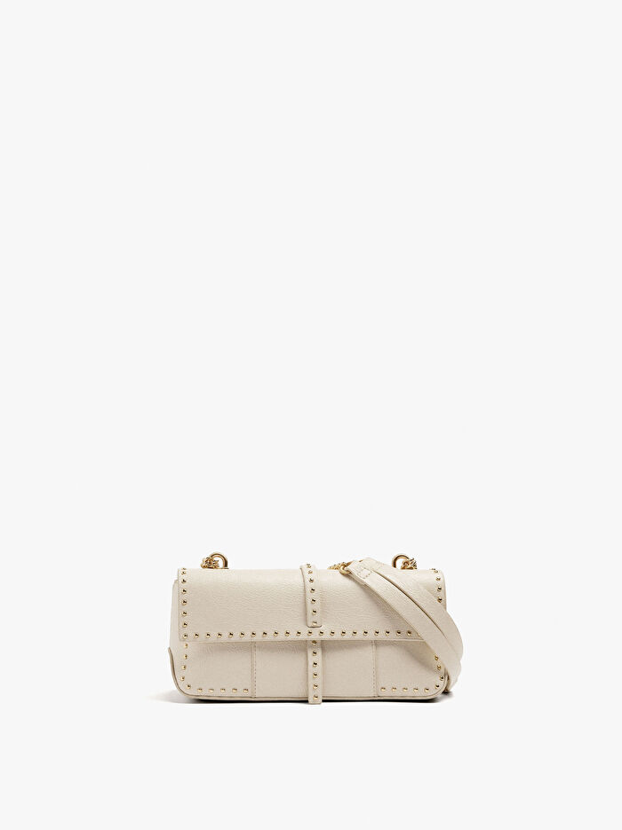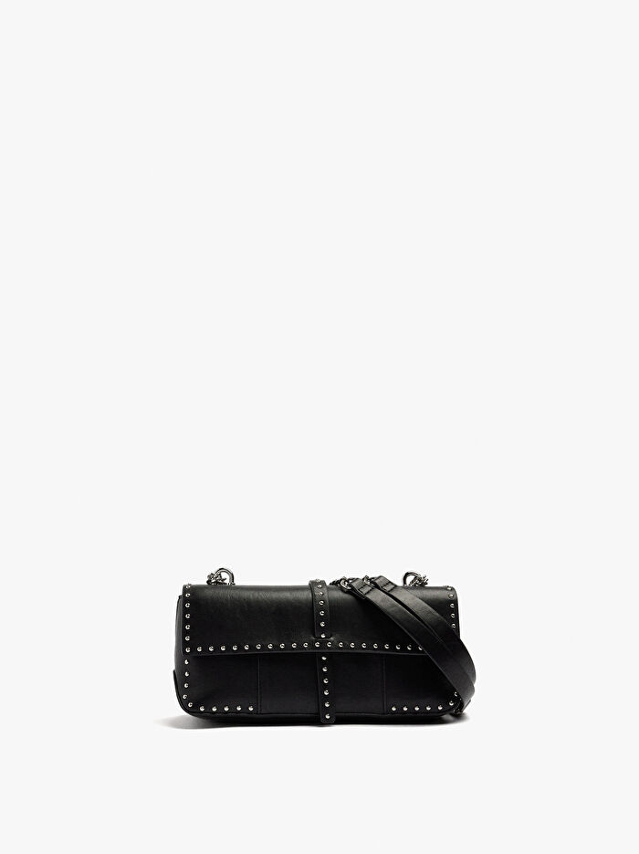 Zımba detaylı uzun omuz çantası. Küçük boy. Kapaklı manyetik kapatma. İç astar. Sabit zincir askı.