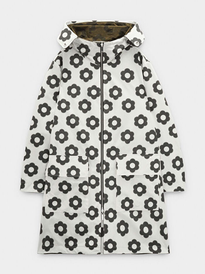 Kapüşonlu, ters çevrilebilir desenli trençkot. Çiçek desenli. Bel kısmında ayar kordonu. Fermuar ve düğme kapama. Uzun kollu. Yan cepler. Model 1,77 m boyunda ve XS-S beden giyiyor.