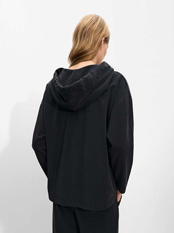 Modal karışımı kumaştan üretilmiş, kapüşonlu, düz sweatshirt. Uzun kollu. Ayarlanabilir ipli. Model 178 cm boyunda olup XS-S beden giymektedir.